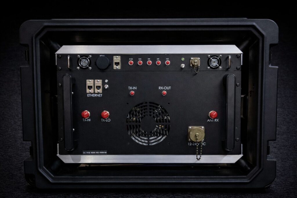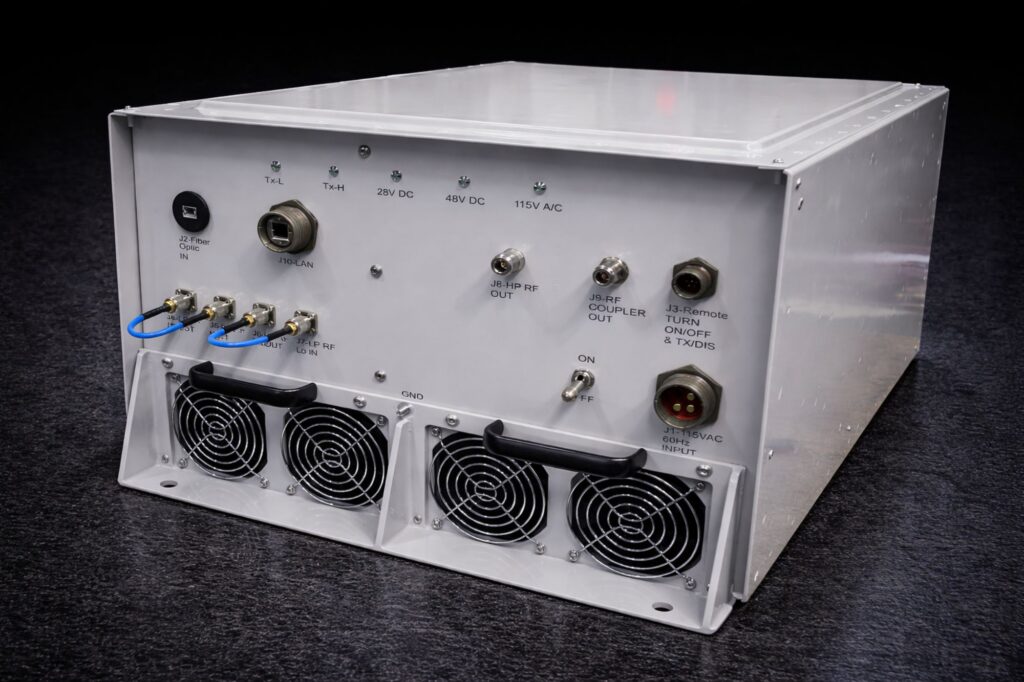 The LRU-400W is a high powered GPS amplification system capable of attacking enemy navigation systems from very long distances. The system accepts both fiber and coaxial RF inputs allowing for multiple operational scenarios. The LRU-400W utilizes state of the art amplification and filtering systems designed to produce 200 W of RF power on each of the 1160-1305 and 1555-1610 MHz bands. The system can be utilized in a fixed installation environment for a forced protection application or can be mobilized on a command vehicle or naval ship. The system comes in both commercial grade and MIL-SPEC configurations. The CA-LRU-400W is controlled by the U.S. Government and authorized for export only to the country of ultimate destination for use by the ultimate consignee or end-user(s) herein identified.