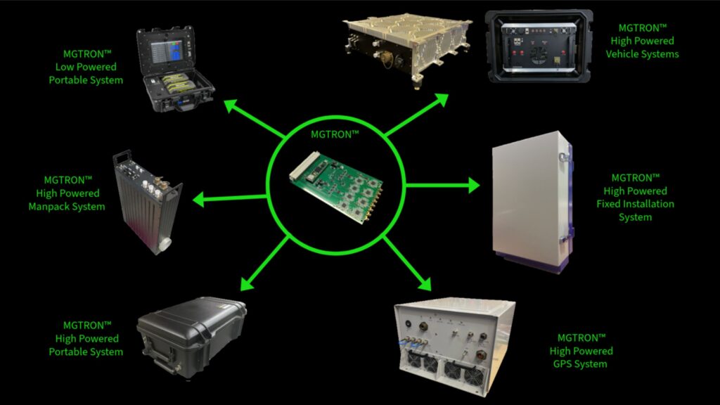 Stealth RF’s suite of NEXTGEN jamming systems include the MGTRON™ signal generator which is a frequency agile jamming system including an ultra-wide frequency range supporting any frequency between 20 – 6400 MHz allowing for mission flexibility and multiple configurations. The system supplies stackable 8 channel signal source modules each capable of being individually programmed to any frequency within the aforementioned frequency range. The system can be configured for single purpose or utilize swappable front-end systems for multi-mission capability. The system also supports vehicular, body worn or fixed installation applications depending on customer requirements. The system targets specific control channels to optimize coverage range and reduce RF signature on the open air